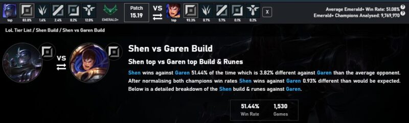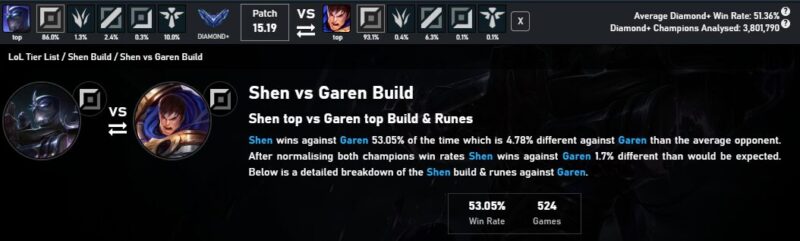 - シェンとガレンの対戦は、統計的にガレンが不利なことが多いです。その主な理由は、シェンが序盤のダメージトレードで有利な点と、ガレン側がシェンのアルティメット(R)への対策を怠る点にあります。