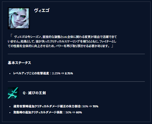 本編でも率直に語られていた通り、現在のクリティカルビルドのヴィエゴは「10人の中で1番上手い自信」が求められる、非常にシビアでミスの許されないチャンピオンです。統計上の勝率が伸び悩んでいるという事実からも、決して「誰が使っても簡単に勝てるピック」ではないことがわかります。