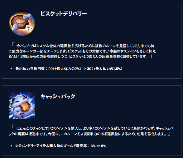- サステイン系ルーンの弱体化による環境変化: パッチ25.21で「息継ぎ」と「ドランシールド」がナーフされた結果、次に強力なサステイン系ルーンとして「ビスケットデリバリー」が採用される流れになったため、このルーンもパッチ25.22でナーフされ、結果として「血の味わい」「息継ぎ」「ビスケットデリバリー」のパワーが低いレベルで均衡した。