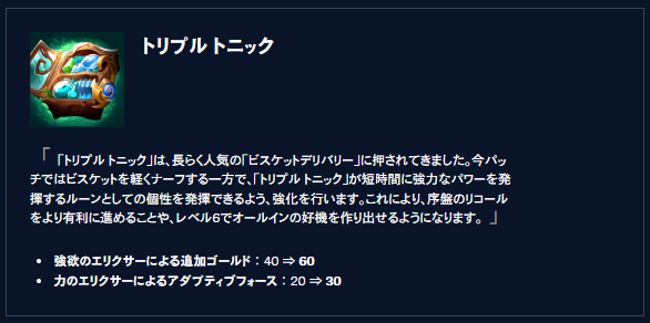 - バフされた「トリプルトニック」の特性: トリプルトニックは、レベル6時のエリクサー効果やレベル9時のスキルポイントの加速を通じて、レベル帯を問わずオールインやキャッチの成功率を高める、一時的なパワースパイク形成をサポートするルーンである。
